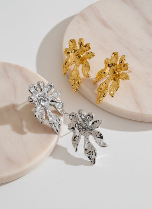 Nos boucles d'oreilles fleuries allient acier inoxydable premium , plaqué or 18K et designs raffinés inspirés de la nature.