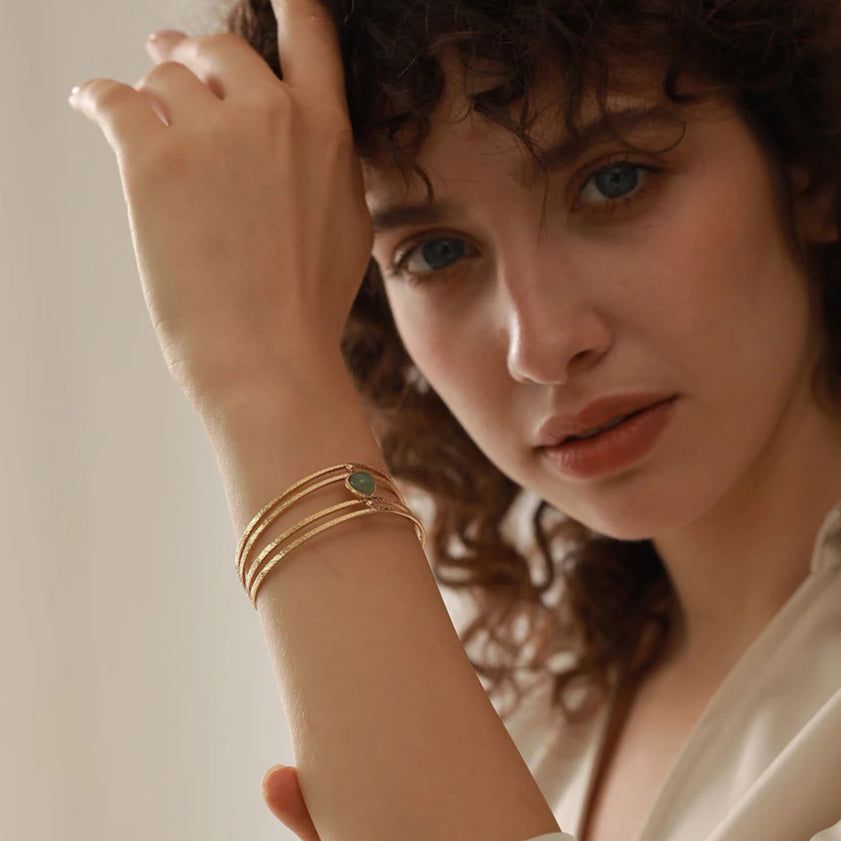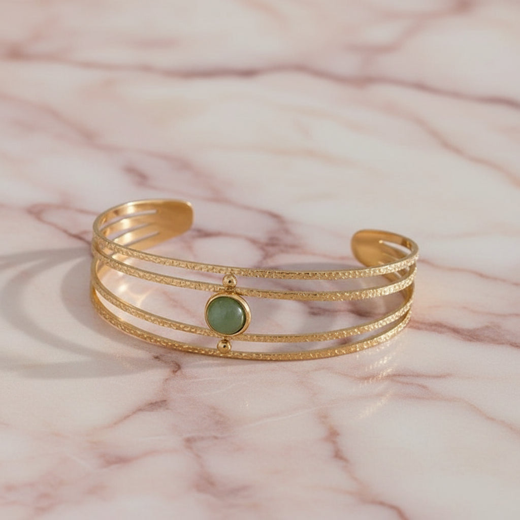 La silhouette ouverte de ce bracelet manchette crée instantanément un effet visuel saisissant. La pierre verte centrale, véritable cœur du bijou, contraste parfaitement avec l' éclat doré du métal pour créer une harmonie visuelle rappelant les trésors d'antan . Ce design bohème s'inspire des influences naturelles et artistiques pour offrir un accessoire qui :